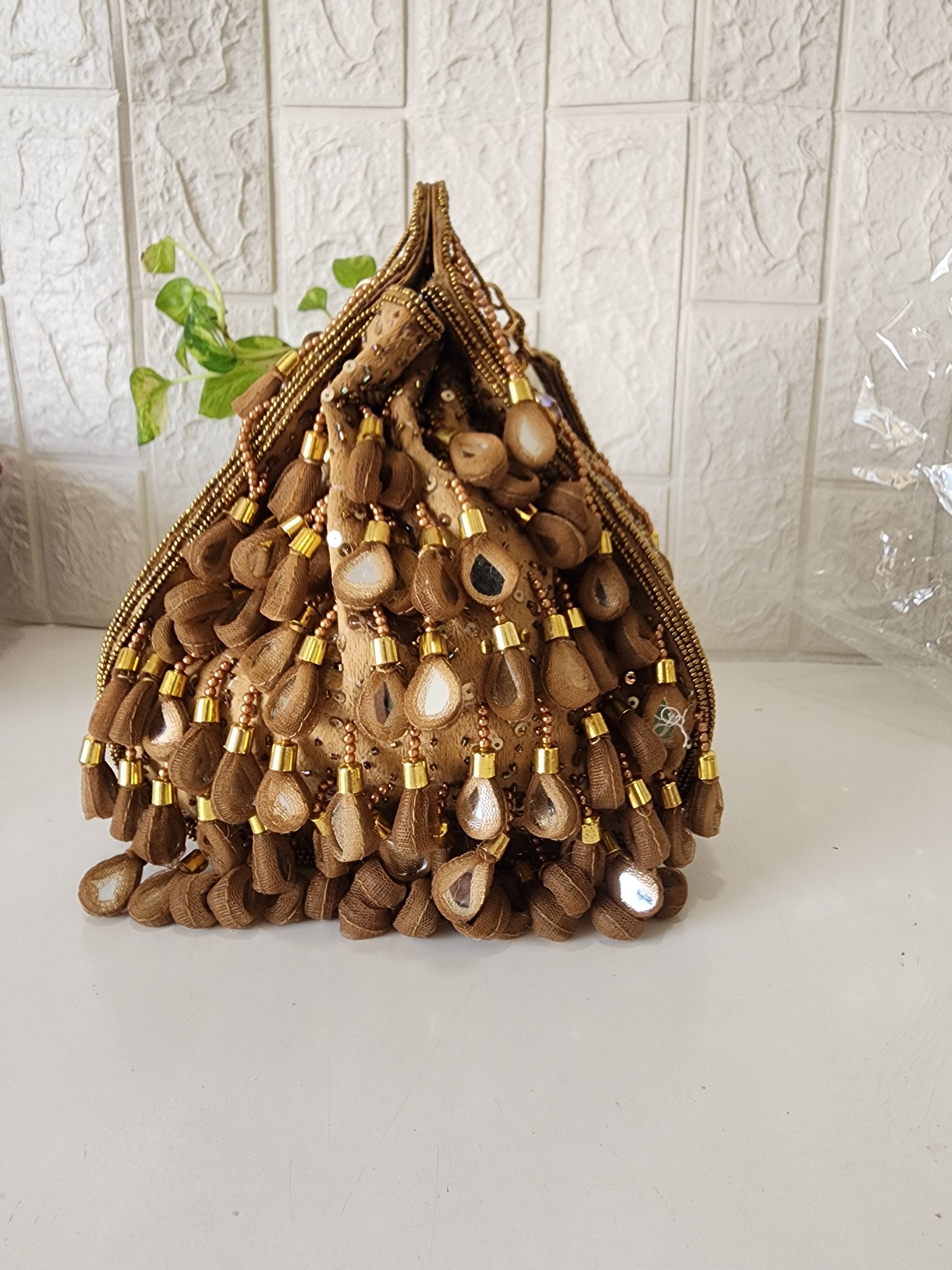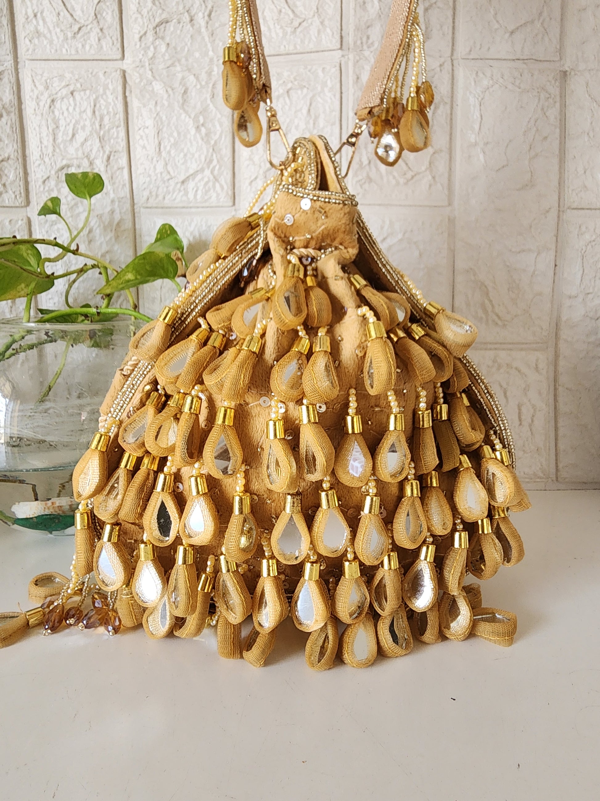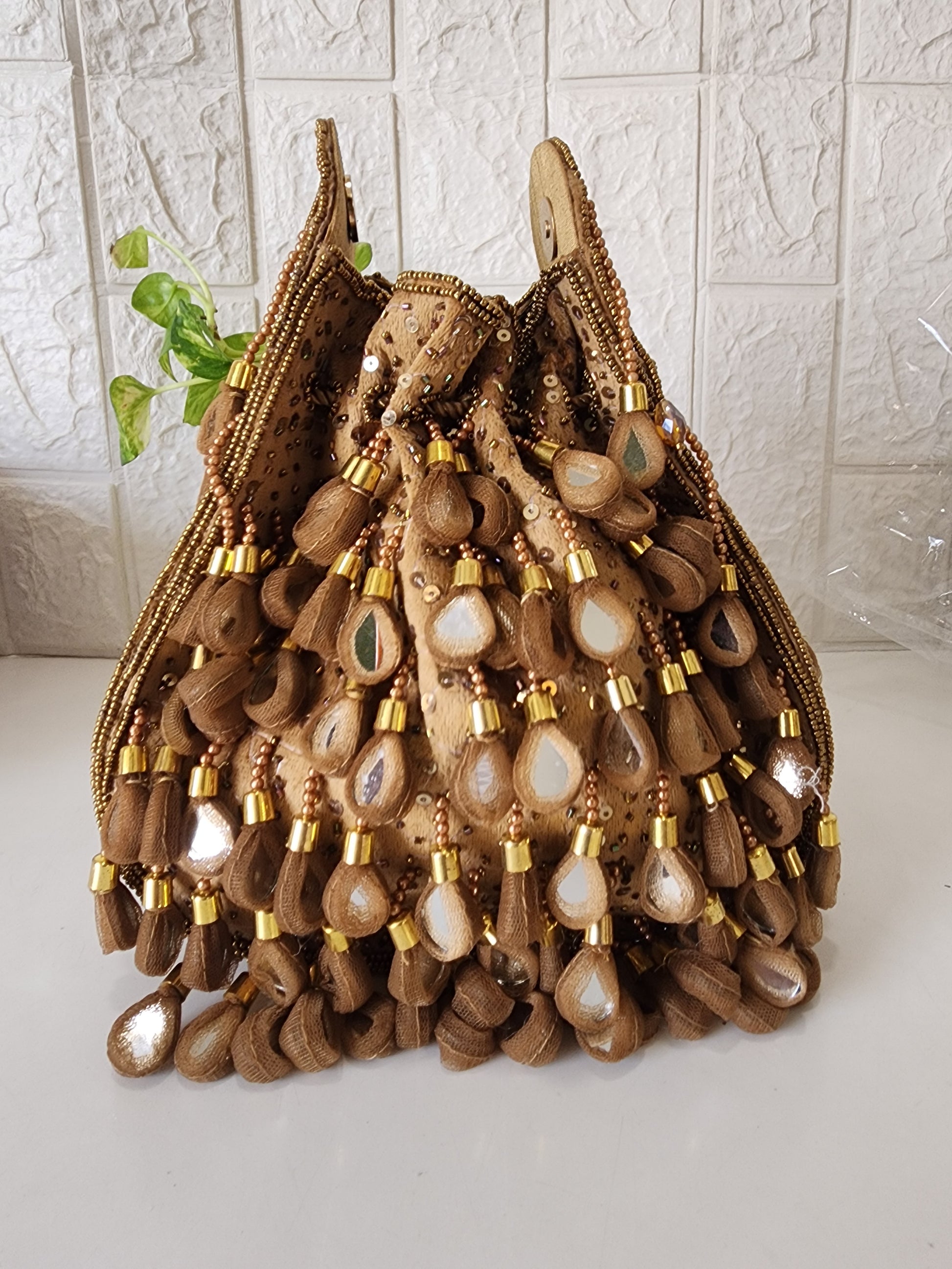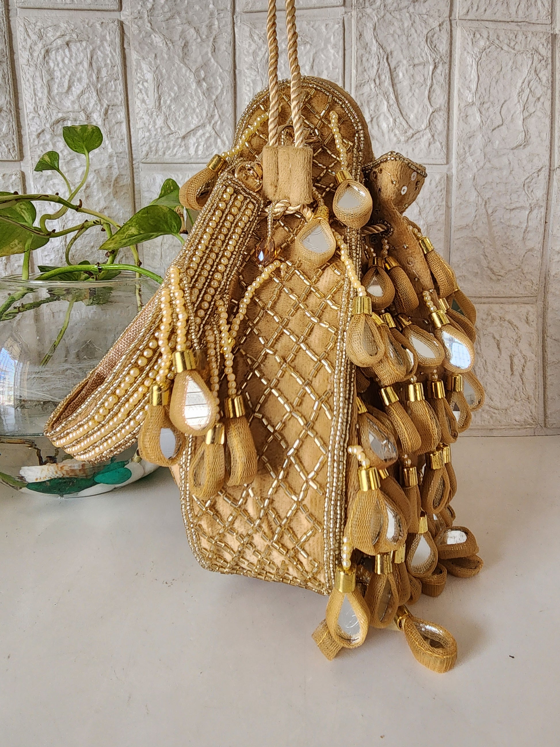 Beautiful potli embellished with mirrors on one side and detailing of handwork on the sides and back.