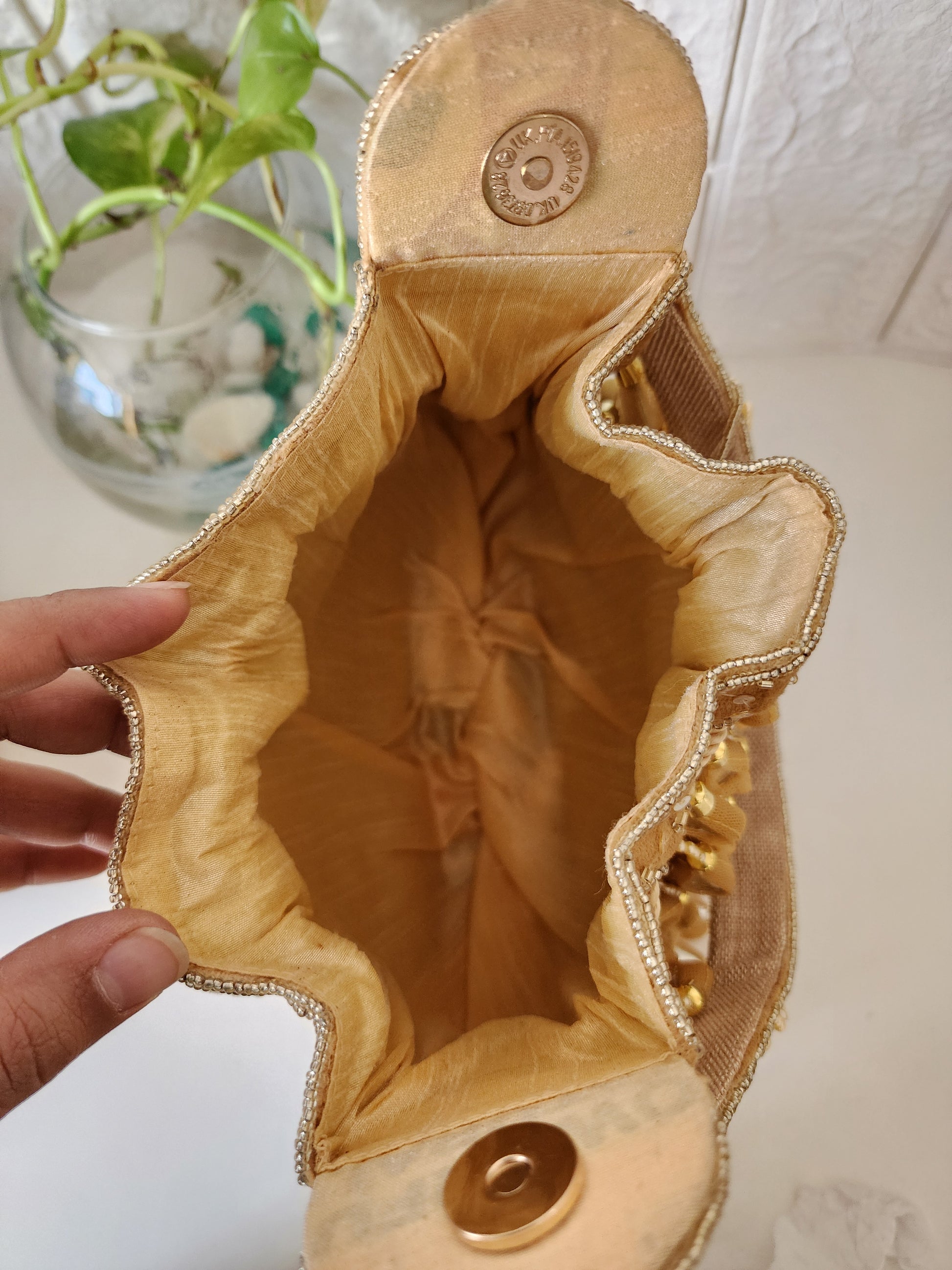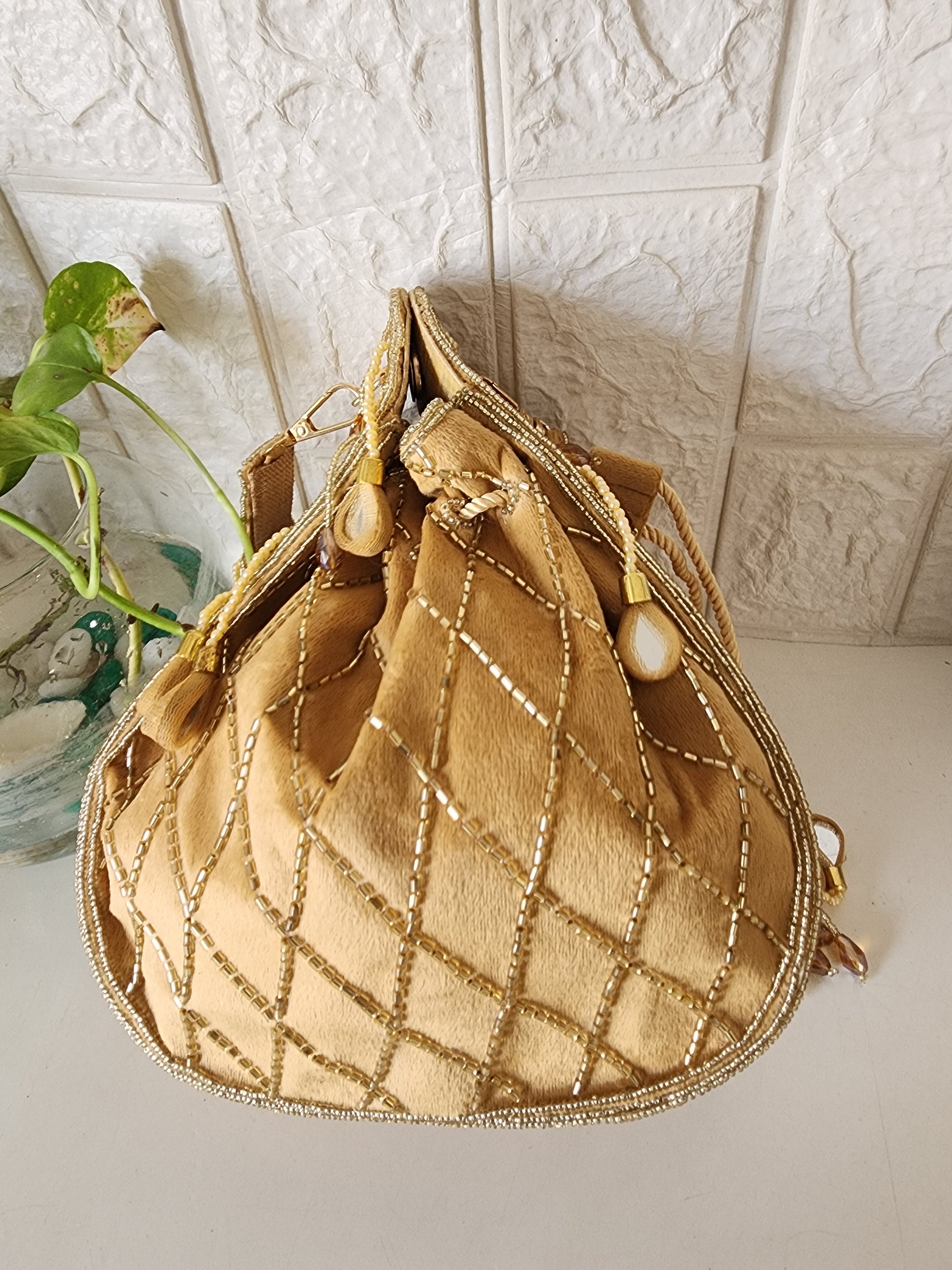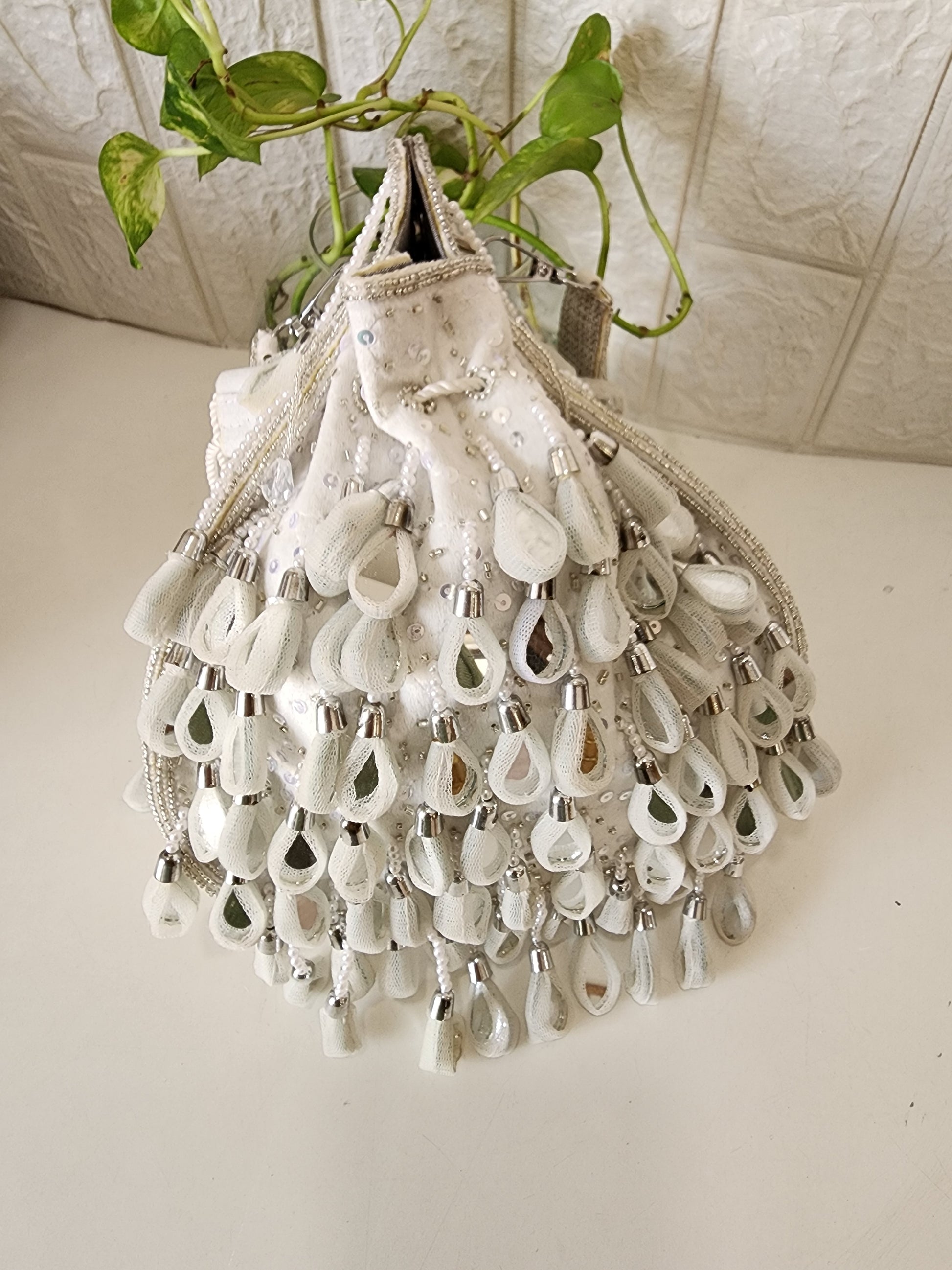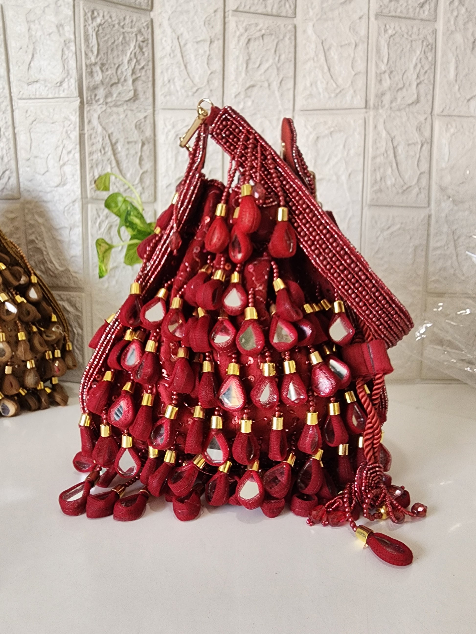 Beautiful potli embellished with mirrors on one side and detailing of handwork on the sides and back.