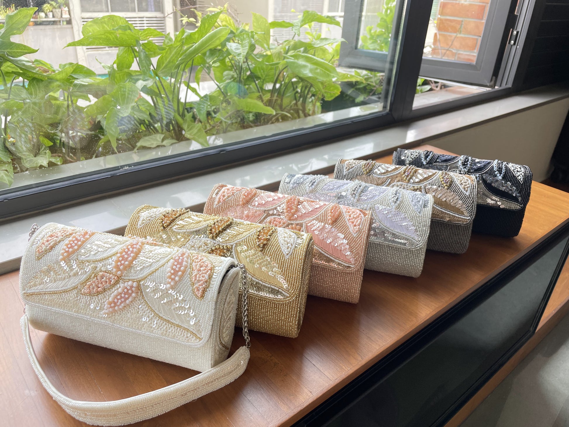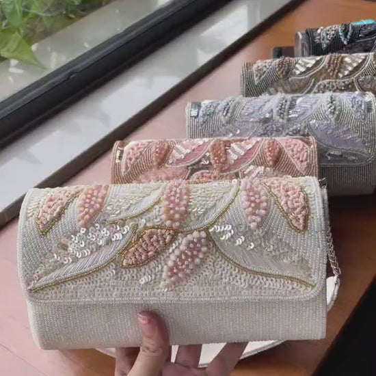 This bag features an elegant blend of traditional craftsmanship and contemporary style. It is adorned with intricate handwork on both sides