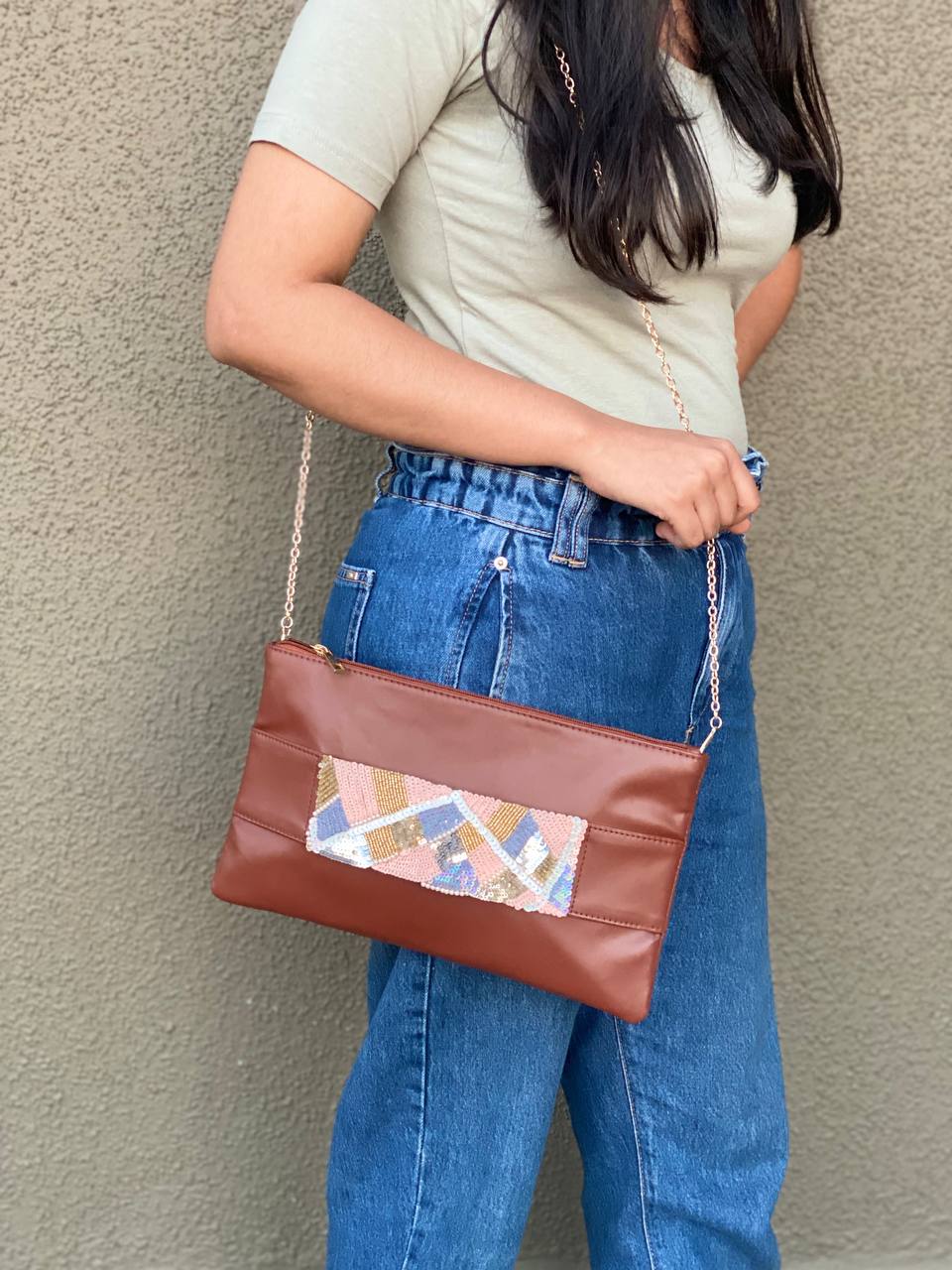 Your go to bag for an event/party as it goes well with westerns as well as traditional dresses. Has one main compartment and comes with a detachable golden chain to use it has a sling. It can be used without the sling as a clutch