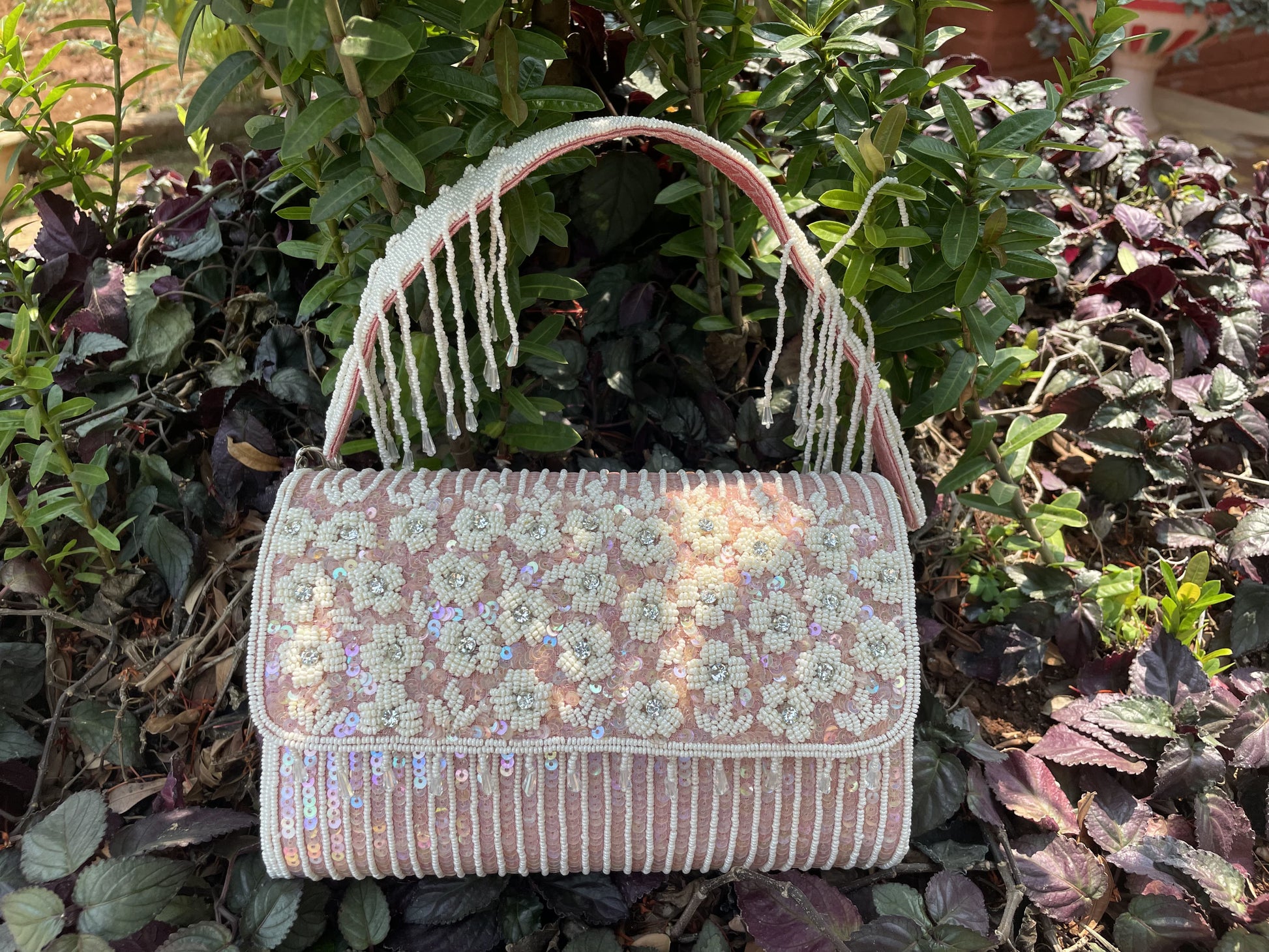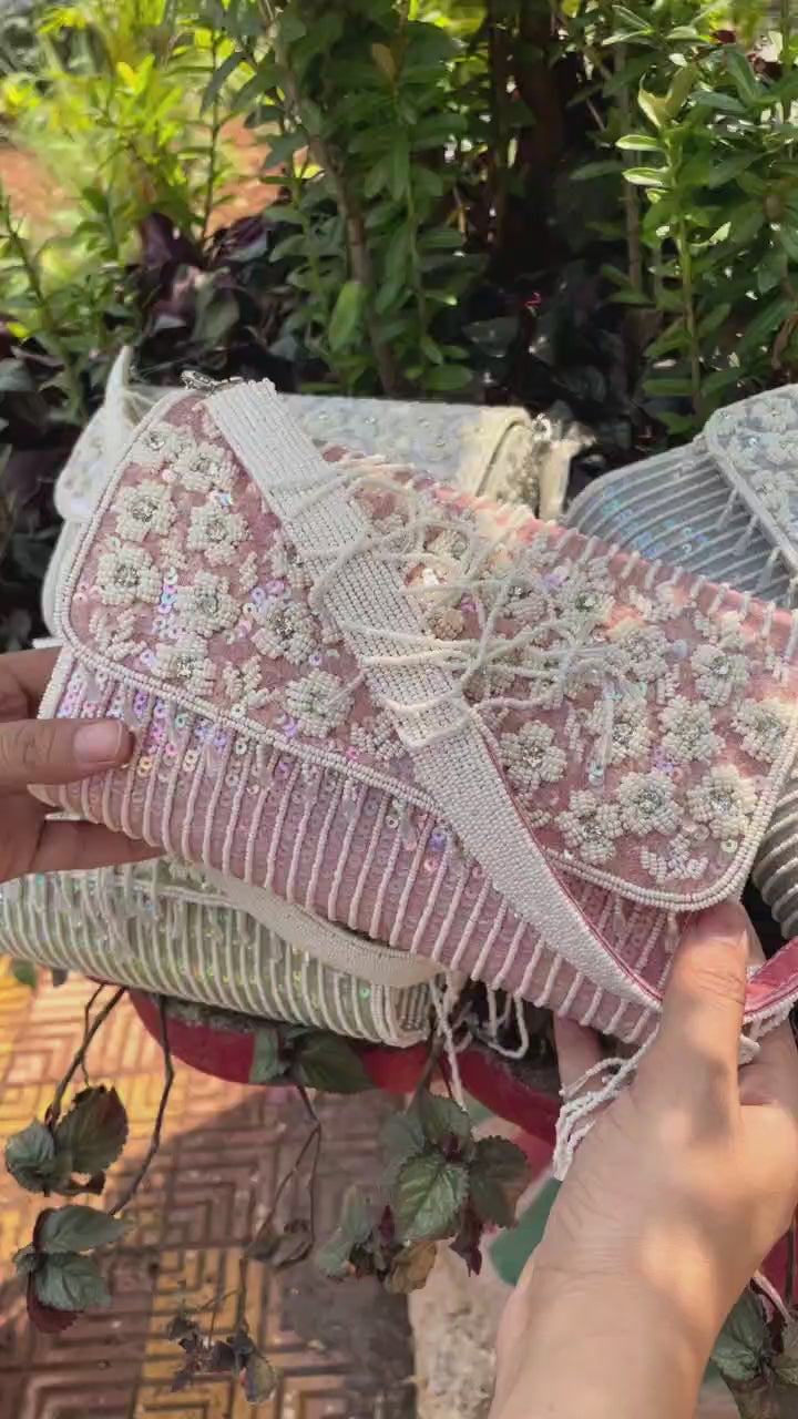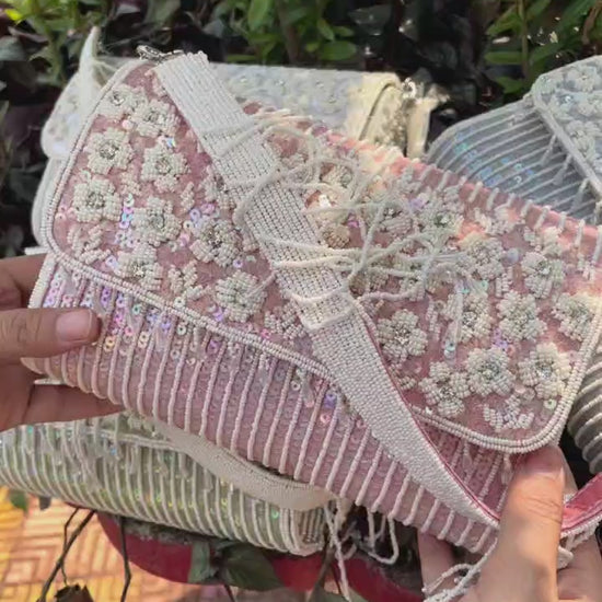 This striking bag features an intricate design, creating a pretty effect with every movement. Its elegant attached handle is embellished with delicate fringes, adding a touch of flair and sophistication.