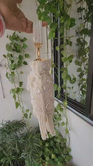 Beautifully intricated with pearls on both the sides. The short handle is perfectly covered with lines of pearls.